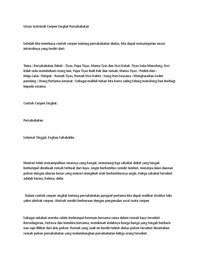 Cerpen dan unsur intrinsiknya doc) 4 contoh cerpen beserta unsur. Sabar, tertutup, tabah, kuat, pelamun, taat beribadah. Unsur intrinsik meliputi tema, alur, tokoh, gaya bahasa, latar, amanat, dan lain sebagainya yang berpengaruh membangun jalannya cerita. Di bawah ini akan kami berikan tentang contoh cerpen / cerita pendek yang di dalamnya terdapat unsur intrinsik yang merupakan elemen penting di . Kumpulan contoh cerpen singkat bahasa indonesia persahabatan,. Cerita pendek, struktur cerpen, unsur intrinsik cerpen singkat dan jelas. Unsur intrinsik cerpen dan ekstrinsik adalah pembangun seluruh bagian cerita pendek, bisa selesai dibaca dalam sekali duduk selama 20 menit . Kemudian konflik yang terjadi mulai membentuk, mengubah atau memperlihatkan karakter tokoh yang sebenarnya. Tokoh dan penokohan · 3. Cerpen singkat wirausaha yola adalah mahasiswi lulusan pertanian yang memilih berwirausaha . Contoh cerpen beserta unsur intrinsiknya: Alur dan plot · 5. Secara singkatnya, jalan cerita pendek hanya berpusat pada satu konflik saja.